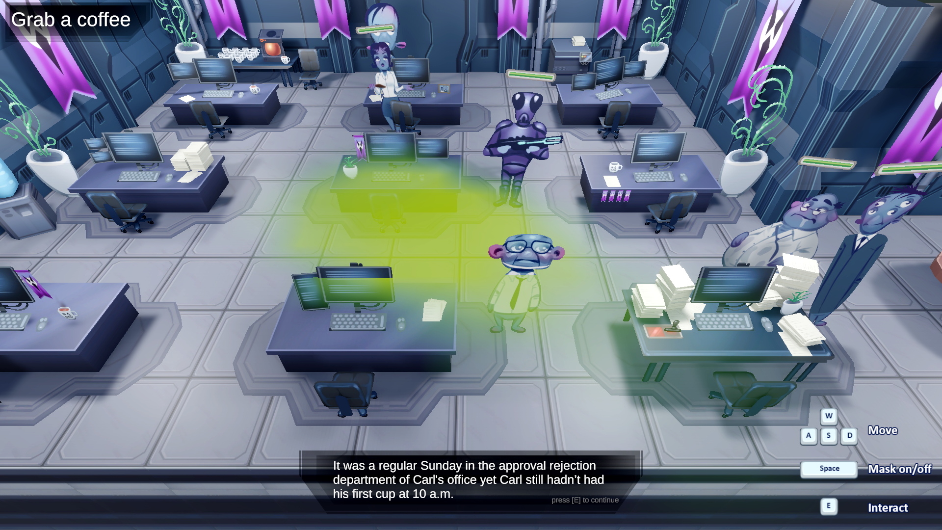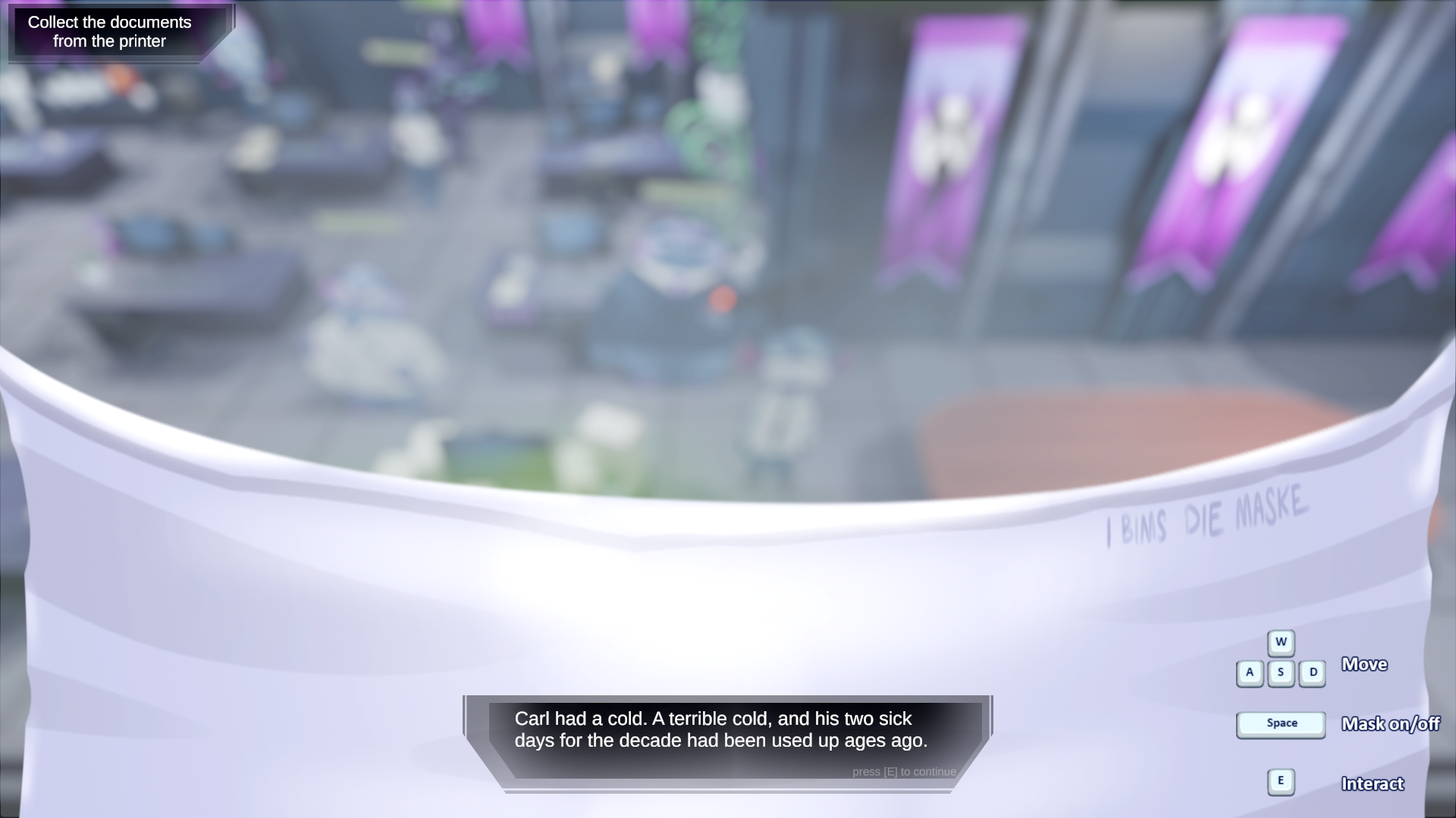 Carl is a sad little guy, obligated to go working in the office of the local death star. He just catched a cold and now he tries his best to prevent infecting other office members, while working on his daily todos.
